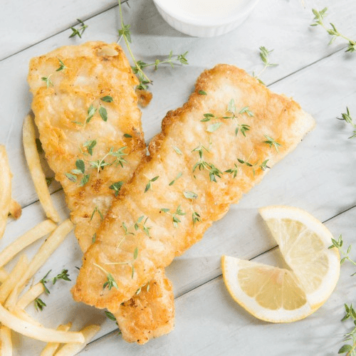 Golden fried cod filets served with fries, coleslaw and tarter sauce