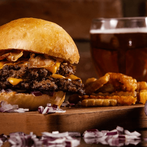 Two 1/2 lb. beef patties topped with bacon and American cheese on a pretzel bun. Served with fries