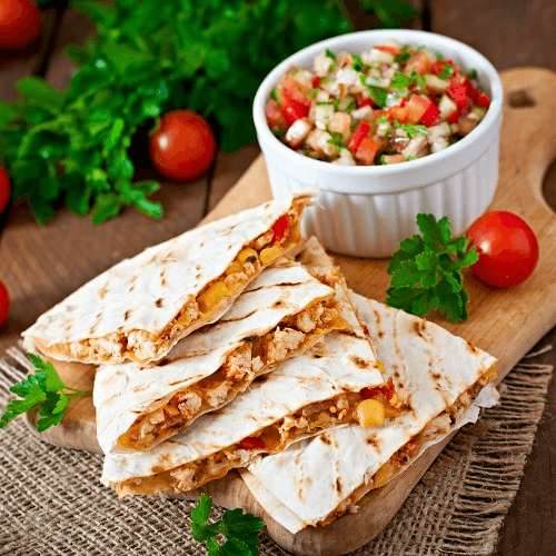 A warm jalapeño cheddar tortilla stuffed with chicken, bacon, cheese and ranch seasoning. Served with tortilla chips and salsa