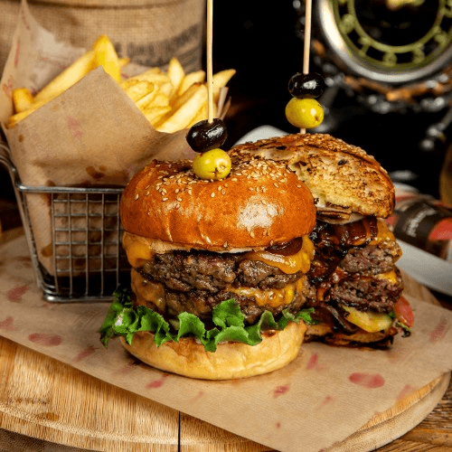 Two 1/4 lb. beef patties smashed thin and grilled to perfection for a flavorful mouth watering burger. Topped with American cheese, lettuce, tomato, onion and pickle on a brioche bun. Served with fries