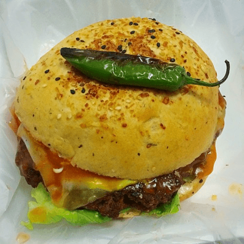 Two 1/4 lb. beef patties smashed thin and grilled to perfection for a flavorful mouth watering burger. Topped with jalapeño peppers, grilled onions, pepper jack cheese and jalapeño ranch sauce on a brioche bun. Served with fries